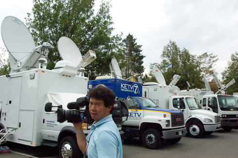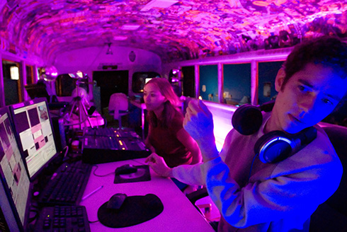 Upstart Mania TV — Fresh graduates producing broadcasts from an old school bus in an industrial park. © Kevin Moloney, 2006
