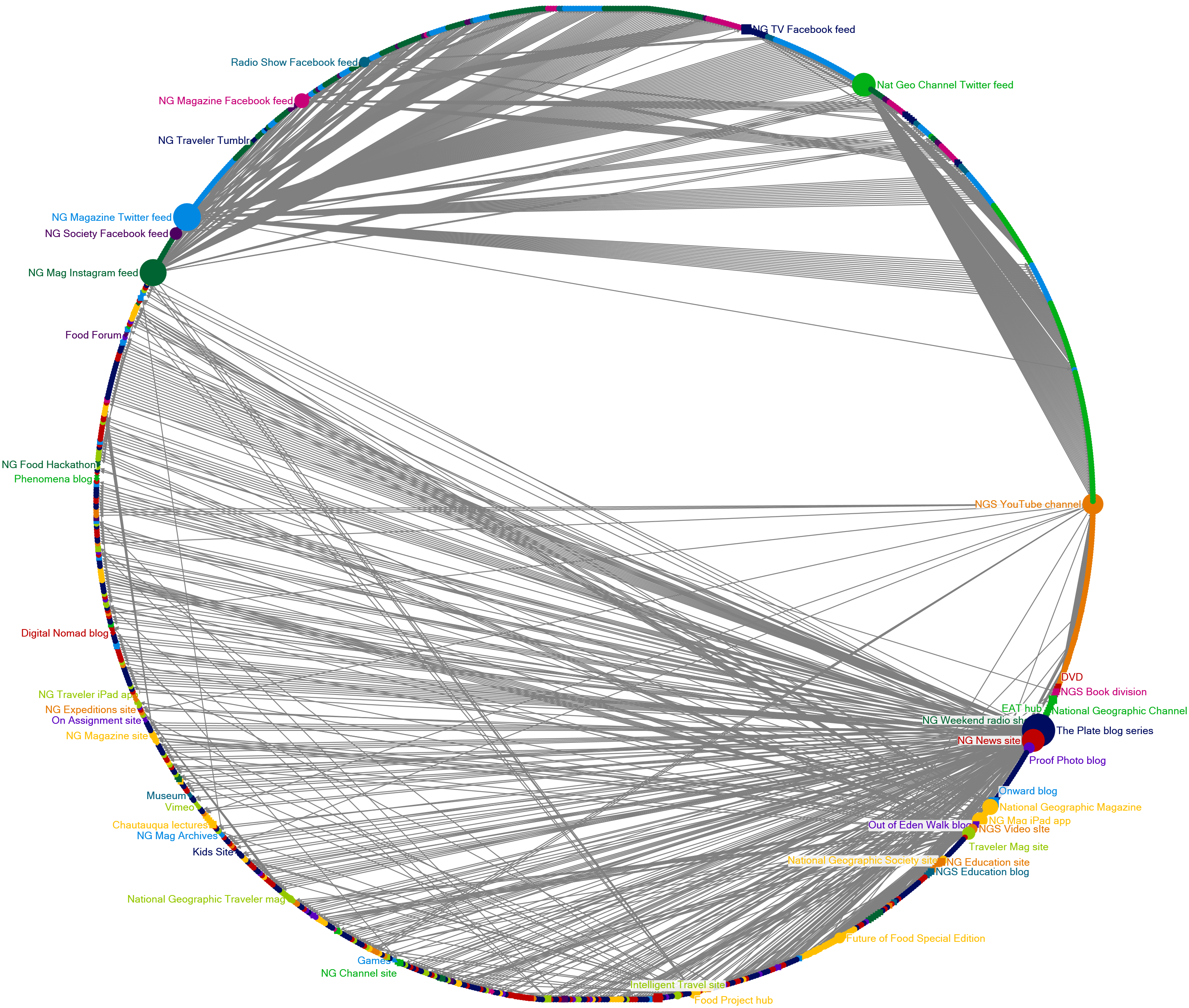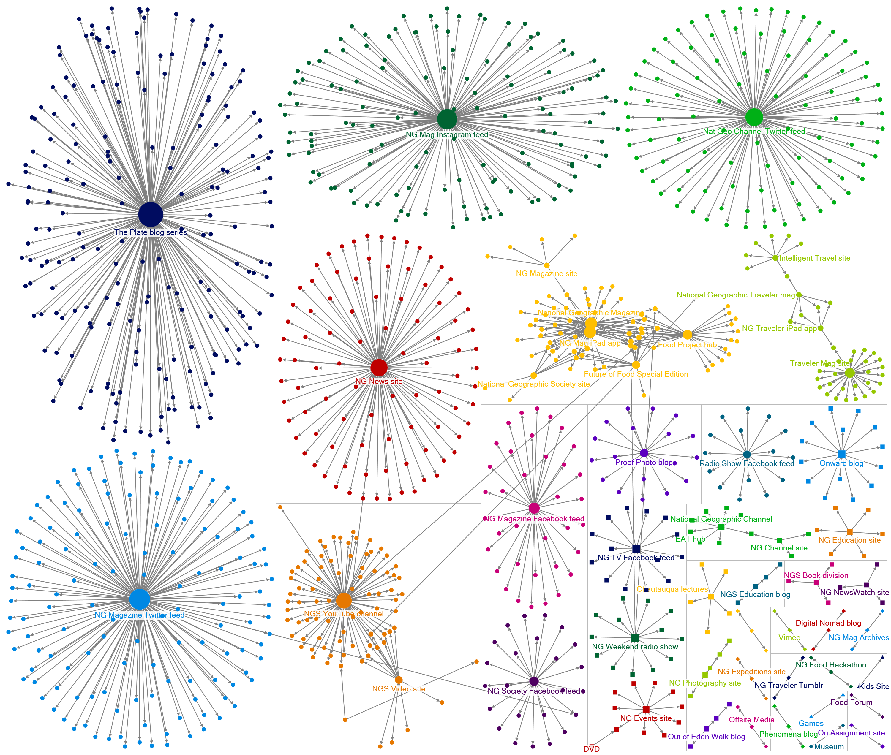 As seen above, the channels that produced the most material are also the most social — The Plate blogs, Twitter and Instagram. Though the channels at bottom right seem simple and small by comparison, this does not represent their depth or the time required to produce their stories. On the contrary, some of the smaller and more tightly contained networks, such as the museum exhibit, may be the largest and most expensive. What is represented by these graphs are possible connection points with other networks, increasing the visibility and influence of a story. The museum exhibit, for example, is only available at a specific brick-and-mortar location for a limited time and cannot be experienced by secondary online means. The most complex network structure above, in yellow, is that formed by the National Geographic magazine, its digital editions and the FoF project hub. Though the network is small, it is highly interconnected, allowing for exploration through the project’s storyworld.