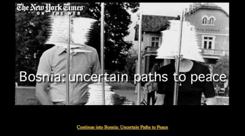 In 1995 and 1996 the New York Times was ready to experiment. “I said that since the Web was new we should try something new,” Ritchin explained. He “gave them a list of ideas and this was one that they thought made the most sense — it was a transitional moment for them, and there was a certain openness that went along with it.” It was, however the first and last of its kind at the Times, and my research thus far has turned up no others. “It’s strange,” Ritchin told me, “but I always thought of the Bosnia project as being a primitive example of what can be done, and all these other projects would follow that would push various ideas more deeply, as well as coming up with very different approaches…” He adds, “basically institutions are very slow to change — if someone else does it (independently) they can then point to its success and do something similar (or even publish the same project) — so another question would be why so few independents are engaging journalism, and the world, differently?”