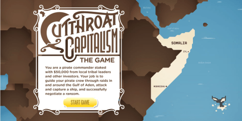 Games provide one way for the members of the public to immerse themselves in a story through action and first-person emotion. Games also illustrate how a system works better than anything else. Games as a method for experiencing a piece of the news are also starting to appear more frequently. Examples of ”news games” include Wired magazine’s “Cutthroat Capitalism,” a game that accompanied a piece on Somali pirate raids. Game design professor Ian Bogost of the Georgia Institute of Technology described it: “A smart player will rarely fail — and that is the strongest rhetorical point presented in the negotiation process. If a ship can be captured, its hostages and cargo are always worth something.” (Emphasis in the original) The point of the game is to show the economic incentives of piracy in an engaging, first-person manner. “Games allow us to address systems instead of stories,” Bogost told The Atlantic in an interview. “In particular, they can offer this experience of how something works rather than a description of key events and players.” Games continue to build clout as a reporting tool. The New York Times in 2007 published on the Web several games created by Bogost and his Persuasive Games designers, and a new game is anticipated from the Times in 2011.