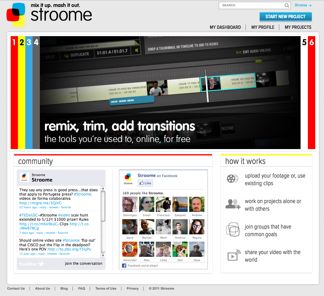 Remix is an old culture in newsweekly journalism. For example, as a correspondent for Newsweek, I would join other Newsweek correspondents around the world in contributing material for a single story. We would all send in our individual reports to headquarters in New York where a “writer” would edit our material into the piece that would appear in the magazine. Stroome is based on the same principles. Multiple people can contribute to one story by uploading their video onto Stroome and it can be remixed right in the browser into a finished piece that can be quickly shared across the web. Stroome pushes the newsweekly idea even further, creating a social networking site that celebrates what’s possible on the web today. Multiple people can remix any story and that means any contributor can choose to have a voice on how the story should be told.