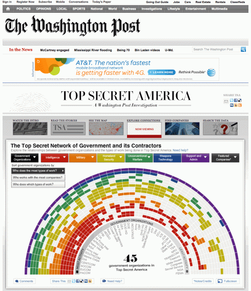 In a more recent example, the Washington Post in the summer of 2010 published the results of a two-year investigation of U.S. national security infrastructure. “Top Secret America” involved more than a dozen reporters, editors, designers and bloggers from the Post who collected and digested information about American security agencies and their contractors. They assembled it into a vast relational database designed to illustrate the size of an industry that they argue is tantamount to a fourth branch of government. The story, which ran in series starting on July 19, 2010, featured written stories, photographs, videos and interactive Web graphics built to explore the incredibly complex relationships between the agencies and contractors involved. The complexity of the subject lends itself to a deeper transmedia implementation. The interactive graphics attached to the story on the Web site do illustrate another option in drillability. Exploring the ways in which agencies and corporations, federal, state and local governments and geographic locations are interconnected seizes our interest in exploration. Our instinct to investigate is rewarded with discoveries made from our own actions.
