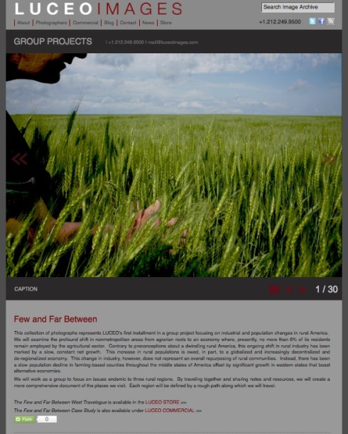 One example is Luceo Images, a cooperative of seven photographers scattered across the country, with one based in Southeast Asia. The cooperative shares the workload of business operation and marketing, and has recently joined forces on a cooperative series of stories on the issues faced by American small towns. According to cofounder Matt Slaby, a subset of the group has already photographed towns in Nebraska, Kansas and Arizona and plans to document four more towns this year while traveling as a group in a rented recreational vehicle. In each case the group will assemble several of their members and work simultaneously to document issues such as healthcare, education, environmental justice, resource management and repurposing the rural economy. By working simultaneously on the project, the group will more easily maintain a cohesive editorial vision. The continuity of the work will also persist despite medium. Though the primary medium of delivery will be gallery walls, the work will also be proposed to news media as individual stories on the themes they plan to cover and assemble in multimedia and video form for the Web.
